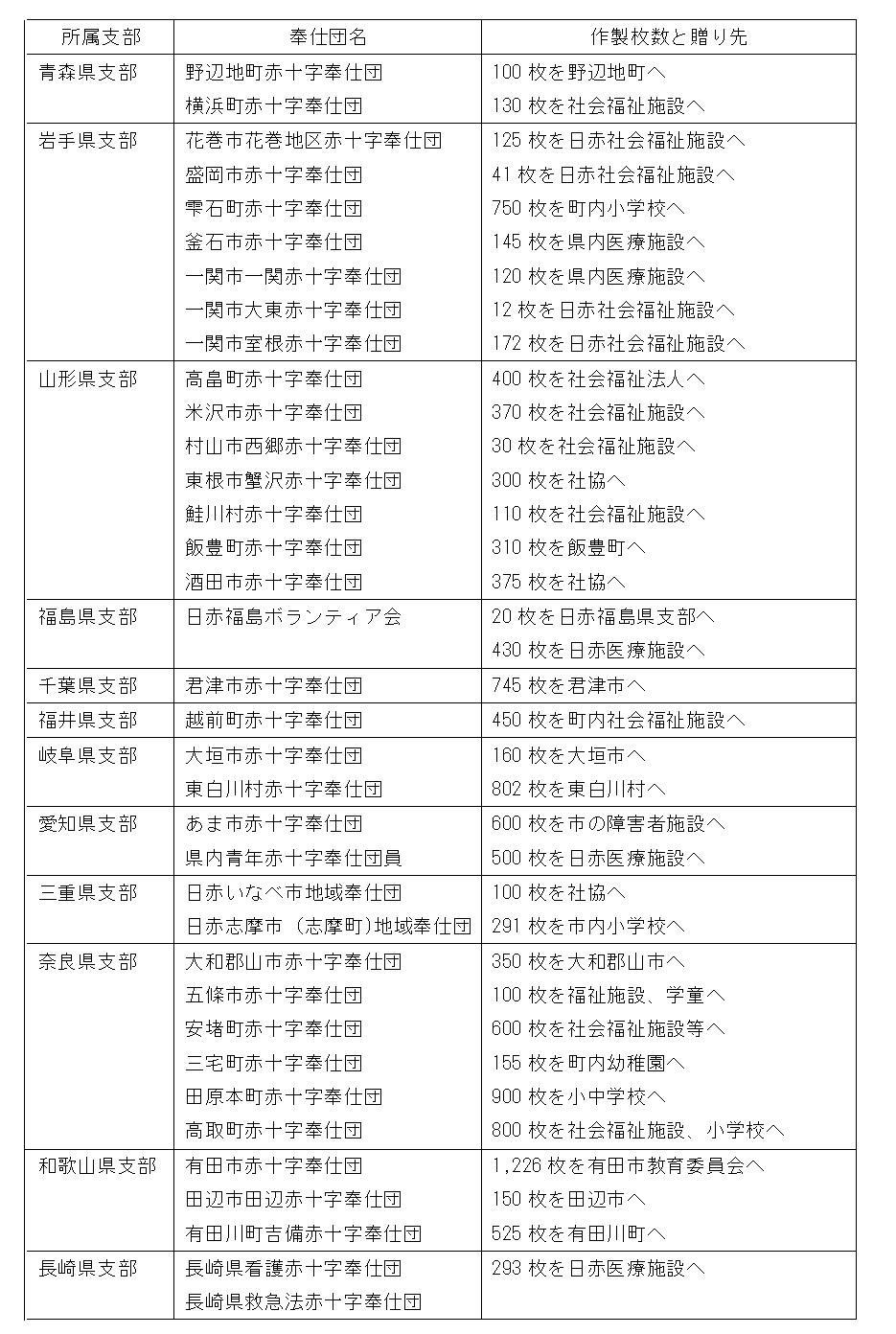 赤十字病院をはじめ、地域の教育委員会、社会福祉施設、医療施設などへ手作りマスクを贈っています。