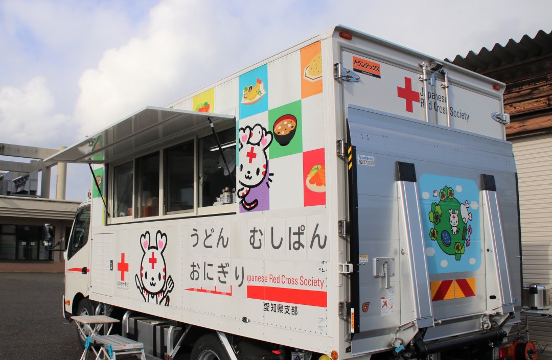 今回、愛知県のボランティアと協力して、農地で収穫されたさつまいもを入れた蒸しパンのほか、卵とじうどんや炊き込みご飯のおにぎりを愛知県支部のキッチンカーを活用し提供しました。