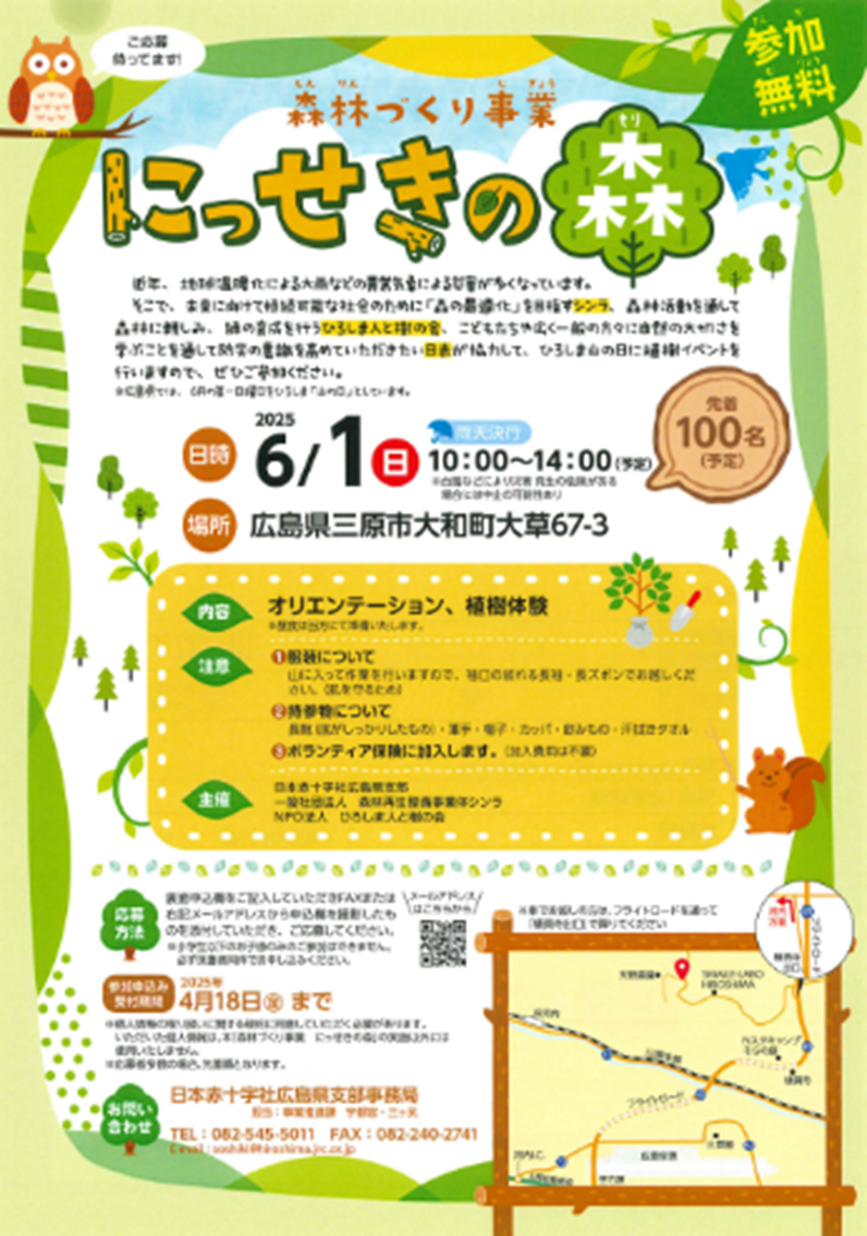 本イベントは、植林活動を行っているNPO法人と日本赤十字社広島県支部が連携して、未来を担う子どもたちの気候変動・環境問題への関心を高め、気候変動への適応や緩和につなげる事業として、新たな森林づくりを目指すものです。