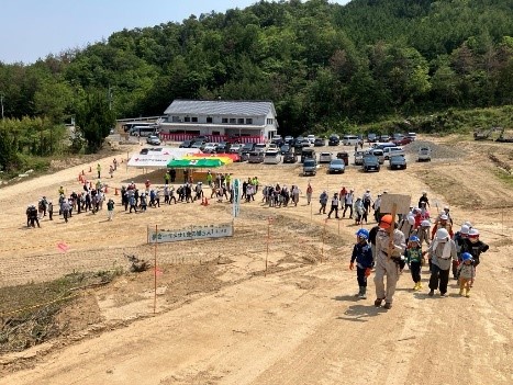 班に分かれて植樹場所に向かう参加者たち