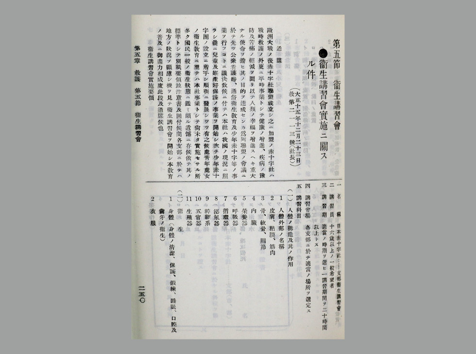 国際赤十字の動きを受け、日本赤十字社は、1926(大正15)年12月23日に「衛生講習会実施要領」を全国各支部に通知しました。