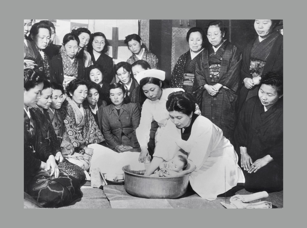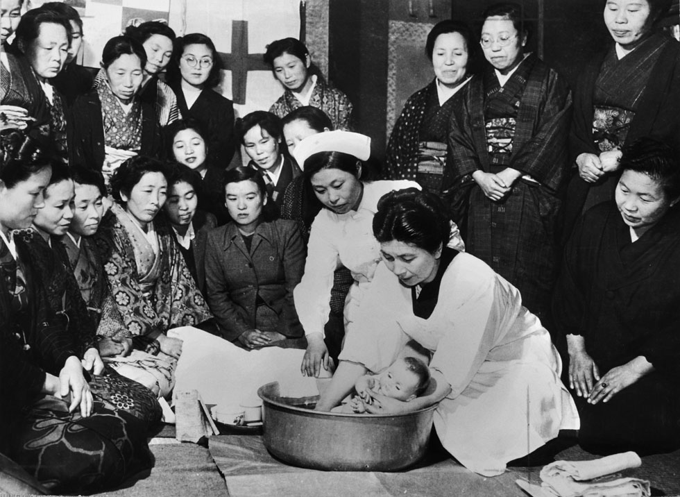 赤ちゃんの入浴法を体験される秩父宮妃殿下(1950年代)