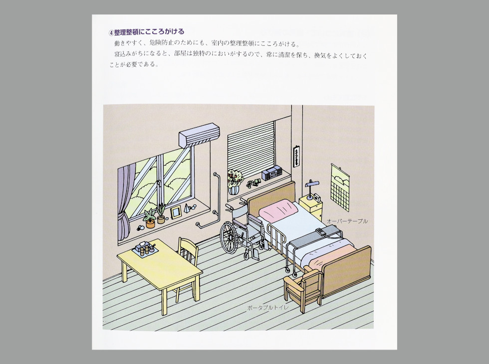 戦後の母子手帳の普及により、妊産婦と乳児の保健に関する教育や支援が行き届くようになったことから、「赤十字幼児家庭看護講習」では、妊産婦と乳児に関する項目を削り、幼児(1歳~小学校入学前)に焦点を当てるように変更。「老人家庭看護」では、それまでの第三部にはなかったリハビリテーションを扱うなど、「寝たきりにしない看護」を目指しました。