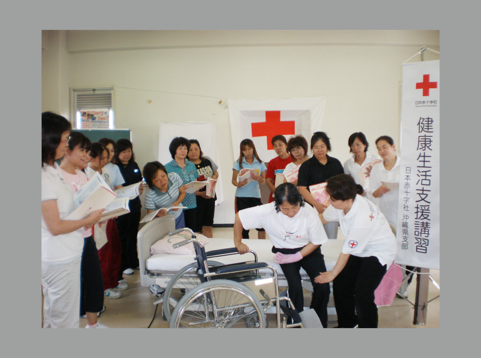 2009(平成21)年4月、日本赤十字社は、高齢者の自立を目指した介護に焦点を当てたこれまでの「赤十字家庭看護法講習」を「赤十字健康生活支援講習」に改編。健康増進・介護予防などを加えました。