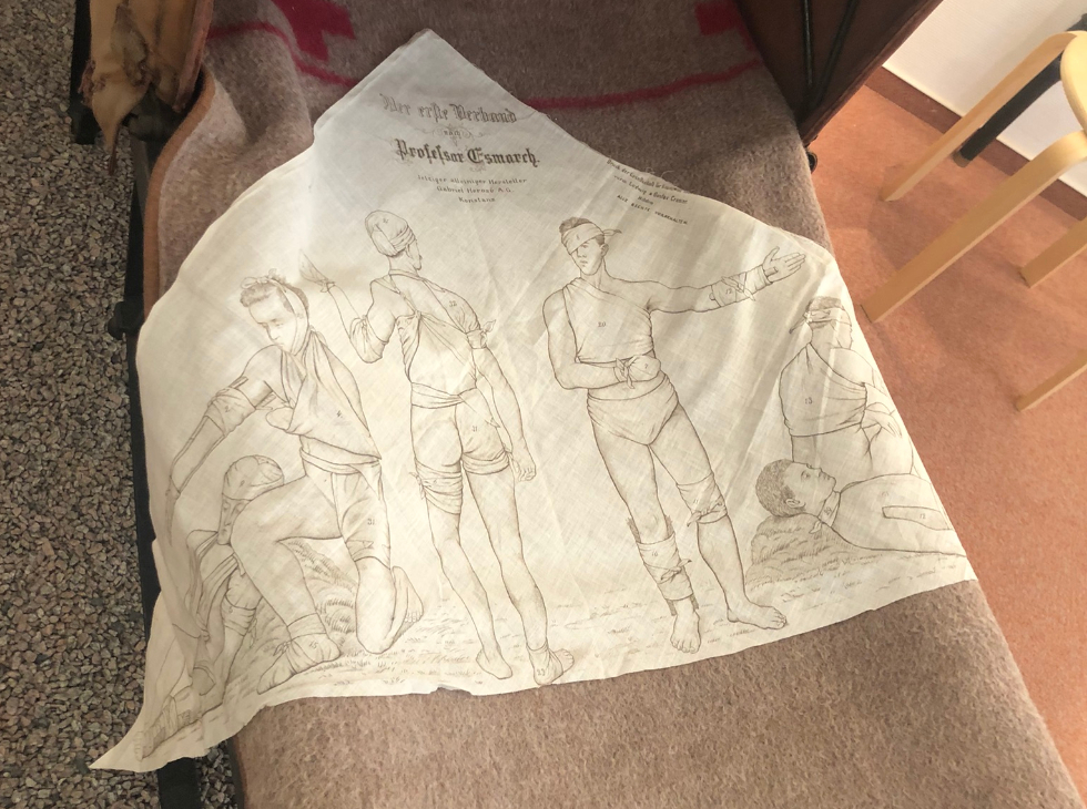 絵入り三角巾(ドイツ赤十字社ルッケンワルデ博物館、普仏戦争展示)