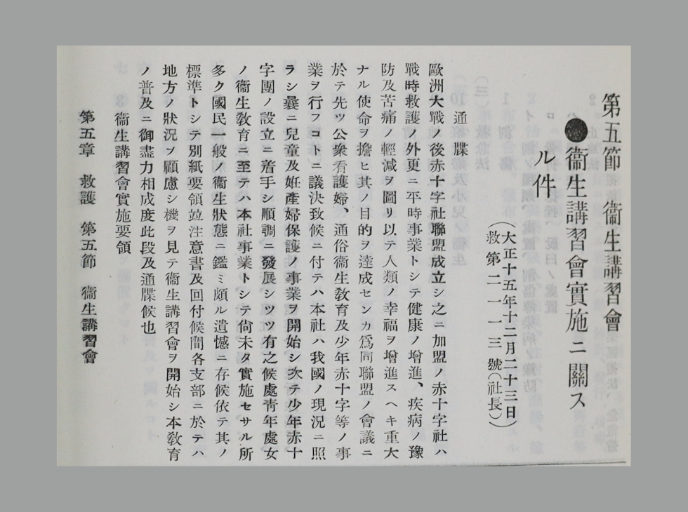 日本赤十字社は、1926(大正15)年12月23日に「衛生講習会実施要領」を全国各支部に通知しました。これが救急法を含む、日赤の講習事業の始まりとされています。