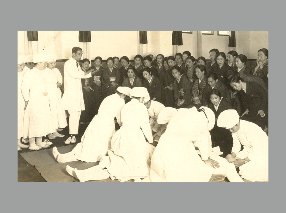 南海地震を機に、1947(昭和22)年10月、災害救助法が制定され、日赤の国への協力義務が規定されました。日赤は市町村ごとに赤十字奉仕団を組織し、その中から災害時に現地でいち早く第一救護に当たる「篤志救助員」の養成を開始。同年12月には、赤十字病院の医師が講師、看護師が助手になり指導する、「第一救護講習会」が始まりました。