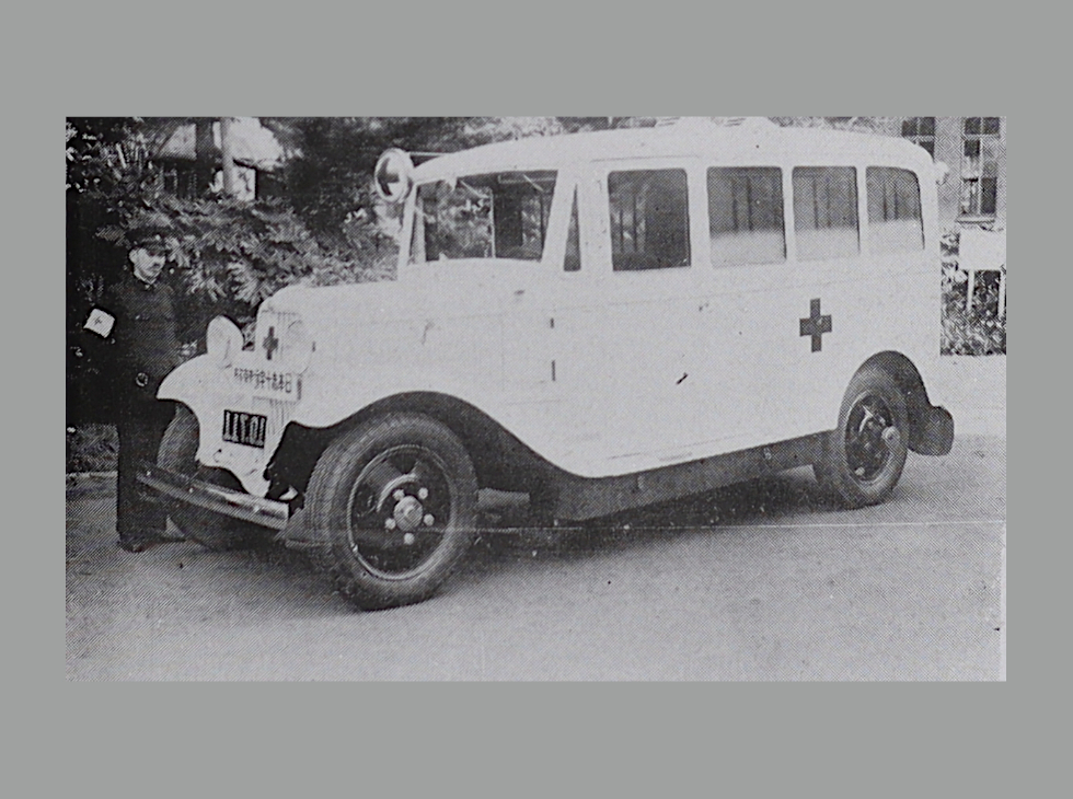 救急法が独立した背景には、交通機関の発達による事故の増加がありました。日本赤十字社は、その対策として1932(昭和7)年、大都市に看護人や事務員が常駐する路上救護所を設置。このとき、日赤大阪支部が路上救護所に配備した車が、日本初の救急車といわれています。